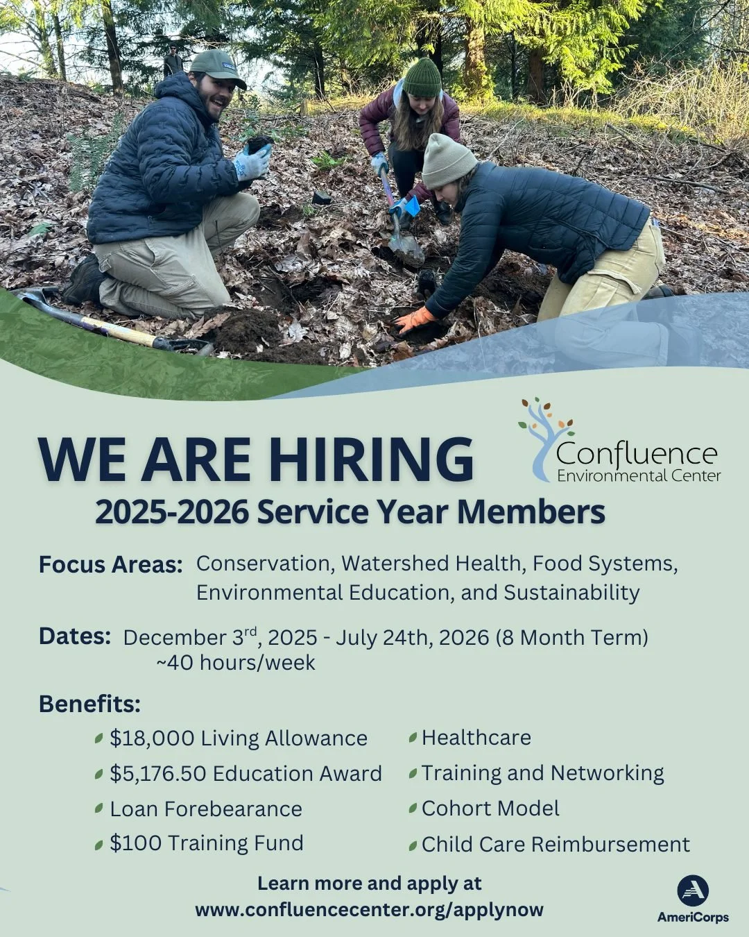 8/27/25 Update: Confluence Environmental Center has received confirmation of funding for the 2025-2026 service year and are now accepting applications for our next cohort of AmeriCorps Members!